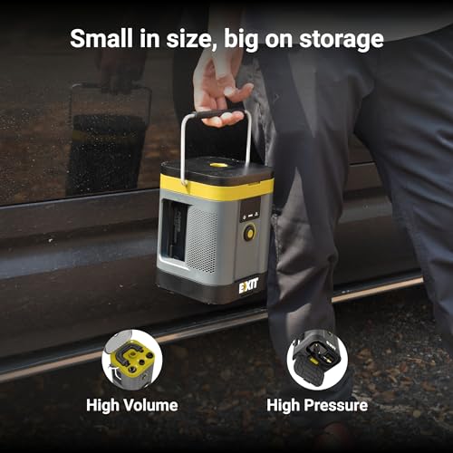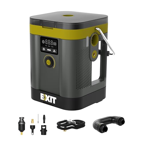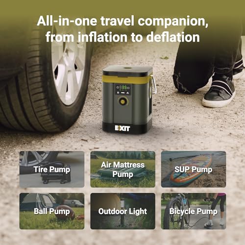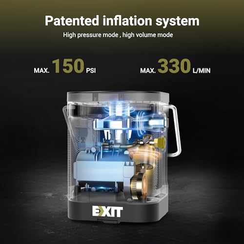 Specification: EXIT 20V Tire Inflator Portable Air Compressor, 150PSI Air Pump for Car Tires, Auto Shut Off, Deflation Function, LED Light, Digita Pressure Gauge for Cars Bikes Sport Balls SUPs, Battery Included