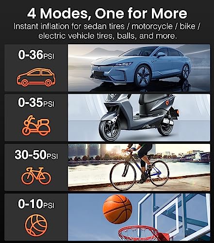 【Dual display & 4+N Smart Modes】PECHAM Portable air tire inflator have high-definition large LCD dual display shows real-time and preset pressure value, which can be used as a digital pressure gauge with 4 pressure unit options- PSI, KPA, BAR, KG/CM. 4 types of preset modes (bicycle, motorcycle, car, and ball) are convenient for beginners to use. The custom mode lets you set the pressure value (3-160psi) according to the inflation object