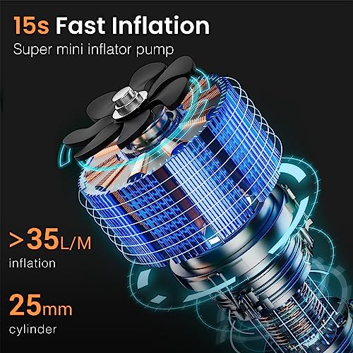 【Fast Inflation 160 PSI Powerful CordlessTire inflator】PECHAM Tire inflator portable air compressor provides max pressure of 160 PSI and airflow of 35L/Min. When the tire inflatior fully charged, 30PSI tires may also be inflated to 35PSI in 5 minutes (standard tire 205/55/R14). Car tire pump takes less than 2 mins to fully inflate a mountain bike tire. This portable tire inflator for car definitely a good helper for solving emergencies on the way