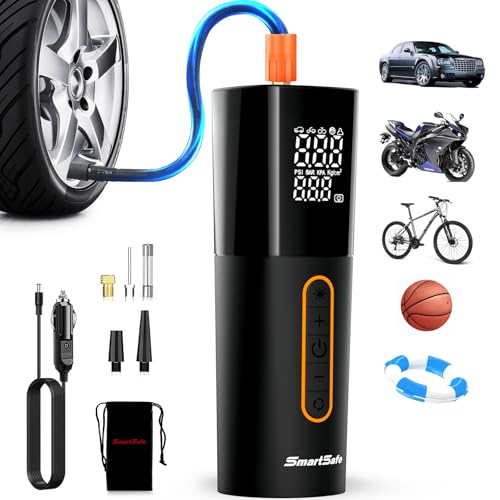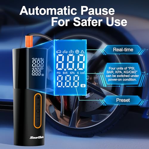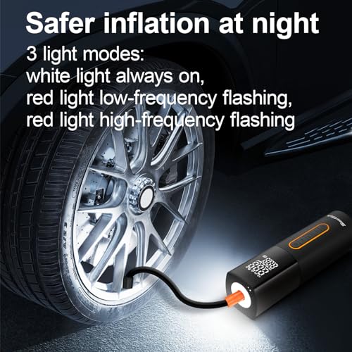 【3 Led Modes & 4 Units To Choose】- This tire pump has 3 LED light modes (Flash + SOS + Strobe) can be utilized to illuminate at nighttime or to warn other vehicles at night, four units to make a choice from, psi, kPa, bar, kg/cm2, as it should be monitor tire pressure. package includes: 1*air compressor portable, 4*nozzles, 1* replacement fuse, 1* user manual.1*9.8 ft dc power cord, 1*Portable bag.