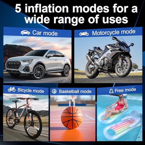 【5 Inflation Modes + Automatic Stop】- This car air pump adopts a high-precision chip, which can display the current pressure and preset pressure at the same time, real-time monitoring of tire air pressure.4 modes: car, bike, motorcycle, ball mode, custom mode, easy to set the pressure value, and automatically shut off when the set pressure is reached, preventing over-inflation.