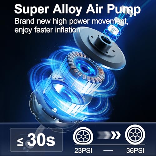 【More Powerful Movement – Faster Inflation】- This tire inflation pump features an upgraded turbo alloy movement that delivers double the inflation efficiency, have higher RPM, up to 50% more efficient than regular air pumps, and inflates car tires from 0 PSI to 36 PSI in about 4 minutes(standard 185/65/R15 tires).(Note-No batteries required)