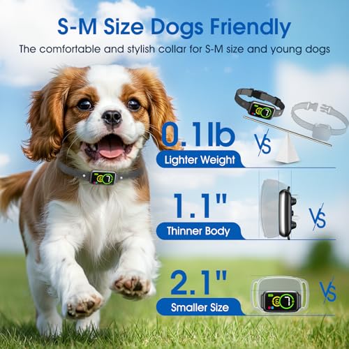 【PERFECT FOR S-M SIZE DOGS, SMALLER, THINNER, LIGHTER AND MORE CHIC】 The small dog bark collar is designed for small, medium size dogs. The dog bark collars for small dogs is lightweight and compact in itself, ensuring that small dogs can wear it comfortably without any burden. The adjustable strap is made of 600D heavy-duty nylon, which is softer and more durable. This stop bark collar is suitable for dogs weighing between 4 and 65 pounds and with a neck size of 6 to 23 inches. Besides, its stylish appearance serves as a great decoration, making your dog stylish and stand out