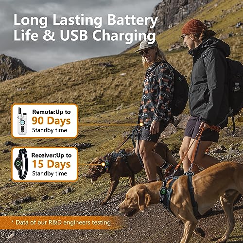 【Quick Charging&Long Lasting Battery】Our electric anti-bark collars come with a universal USB charging cable which can charge the collar and remote concurrently. 90 days standby time for the remote and 15 days for the collars. The big battery design of the electric dog shock collar is special for going on a road travel, camping adventure, trekking, or any journey.