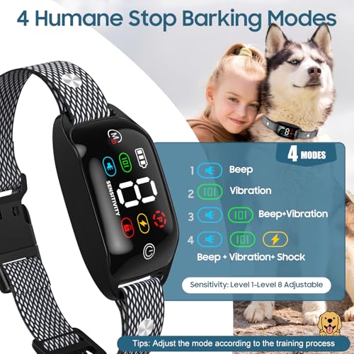 4 Training Modes and 8 Sensitivity Adjustable: This anti bark collars for dogs have 4 training modes to training and stop barking: Beep, Vibration, Beep+Vibration, Beep+Vibration+Shock. 8 level sensitivity can be adjustable according to different environment.
