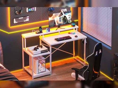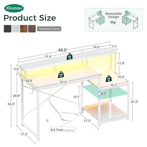 Specification: AODK Computer Desk, 48 Inch Gaming Desk with Led Lights & Power Outlet, Office Desk with Printer Storage Shelves, Reversible Desk with Monitor Shelf & Headphone Hook, White