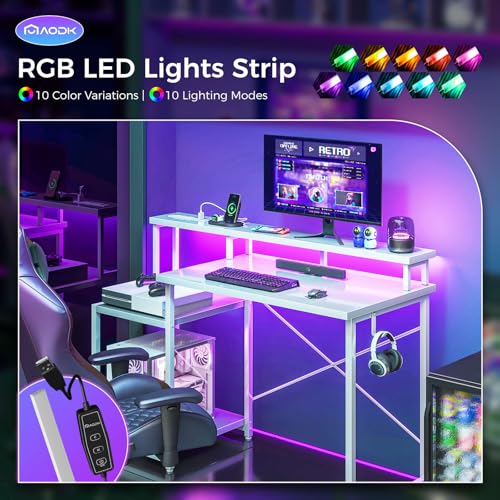 AODK Computer Desk, 48 Inch Gaming Desk with Led Lights & Power Outlet, Office Desk with Printer Storage Shelves, Reversible Desk with Monitor Shelf & Headphone Hook, White