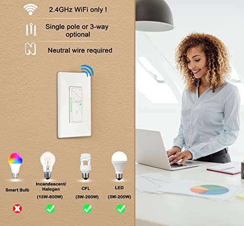 【Things Need to Know】: Neutral Wire is required. single-pole or 3-way optional, connect to 2.4GHz wifi (Not 5GHz). Use for NON SMART but DIMMABLE LED/CFL 3W-200W Max, Halogens/Incandescent 15W-600W Max.