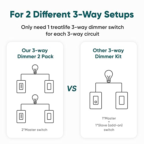 2 Master 3-Way Smart Dimmer Switches: For 2 different 3 way setups, only need 1 treatlife 3-way dimmer switch for each 3-way circuit. Comes with two main switches that could be used independently, you can install one to replace a current three way setup in a hallway and use the other one in a bedroom. Control the dimming of 1 Light from 1 or 2 Places, can be used as a 3-way or single-pole switch. The smart dimmer switch is only for dimmable bulbs