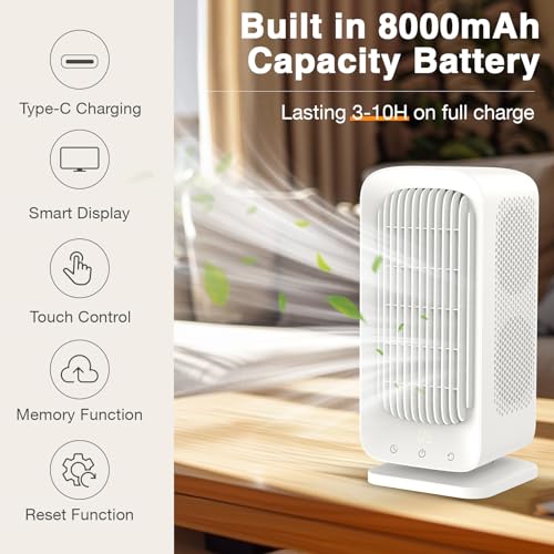 Desk Fan, 8000mAh Battery Operated Tower Fan, 45°/90° Oscillating Fan, 5 Speeds, 8H Timer Tower Fan for Bedroom, Smart Display with Touch & Memory Bladeless Fan for Office Desktop Outdoor Indoor