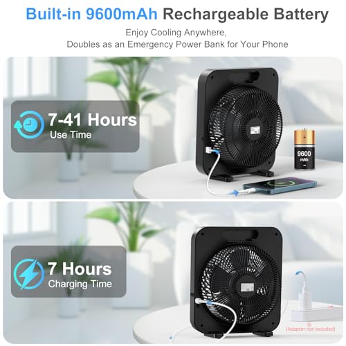 [Extended Cooling and Power Backup]: Equipped with a 9600mAh rechargeable battery that fully charges in just 7 hours, this table fan delivers between 7 to 41 hours of cooling. It also doubles as an emergency power bank for charging mobile devices. With its cordless design, this table fan is easy to move around without the hassle of tangled wires, making it even more convenient for any setting.