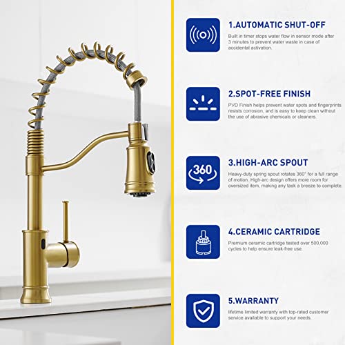 Specification: Brushed Gold Touchless Kitchen Faucet with Pull Down Sprayer Motion Sensor Smart Brass Kitchen Sink Faucet Single Handle Commercial Faucet for Kitchen Sink