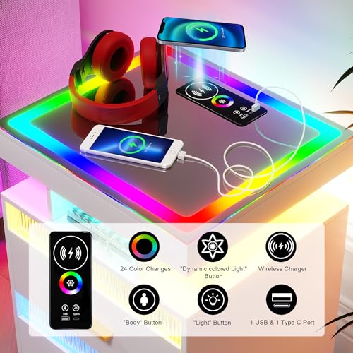 Specification: HNEBC RGB LED Night Stand with Wireless Charging Station, Modern Bedside Table with Human Body Sensor Light, Smart Nightstand with Glass Panel for Bedroom Furniture, Remote Control Lighting (White)