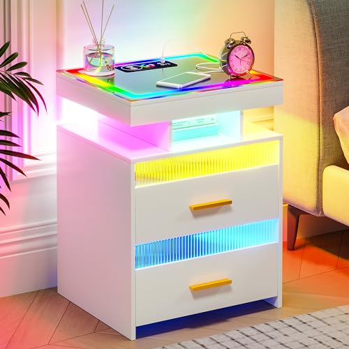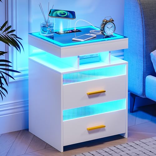 HNEBC RGB LED Night Stand with Wireless Charging Station, Modern Bedside Table with Human Body Sensor Light, Smart Nightstand with Glass Panel for Bedroom Furniture, Remote Control Lighting (White)