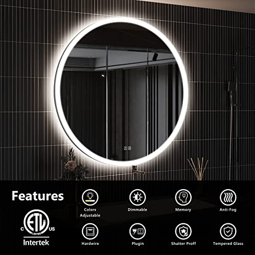 Specification: ROOMTEC 32″ Round LED Bathroom Mirror, Wall-Mounted, 3-Color Dimmable, IP54 Waterproof, Smart Touch, Anti-Fog Vanity Makeup
