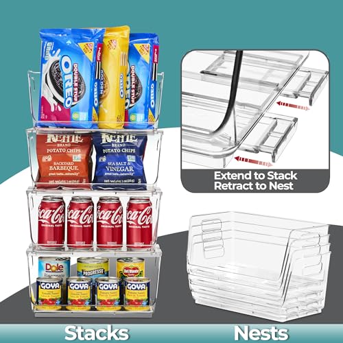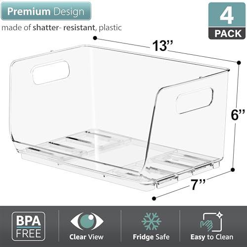 Versatile Use: Great for storing fruits, veggies, packaged goods, yogurts, canned goods, drink boxes, baby food, condiments, cleaning supplies, bath products, makeup, and more. Versatile use as clear open front storage bins, stackable food storage bins, stackable kitchen storage, clear plastic bins for pantry, stackable cabinet storage bins, stackable bins for pantry, open bin storage basket, and stackable pantry bins