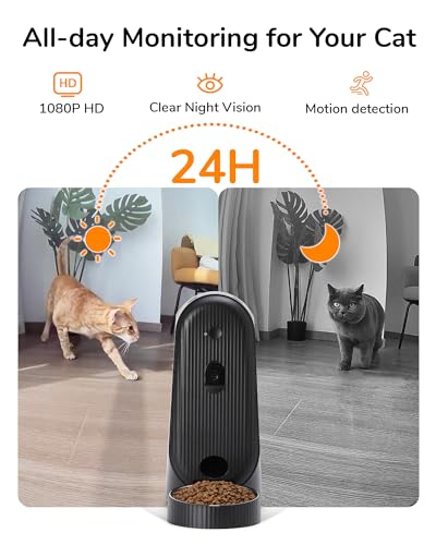 1080P Adjustable HD Camera – The timed cat feeder has a adjustable 1080P camera for clear viewing of your pet and food bowl. Night vision ensures visibility at all times. Motion detection keep you up to date on pet activity.