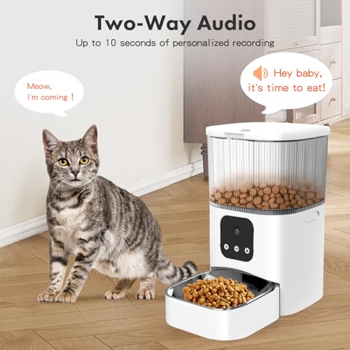 Two-way Audio & Personalized Meal Call: Built-in advanced microphone and speaker allow you to keep in touch with your pet baby anywhere anytime.The auto cat feeder allows you to record a 10S message that will automatically play when the meal is dispensed. Your cats or dogs will come running when they hear the recording of your calling them to eat, making mealtime an interactive and enjoyable experienc.