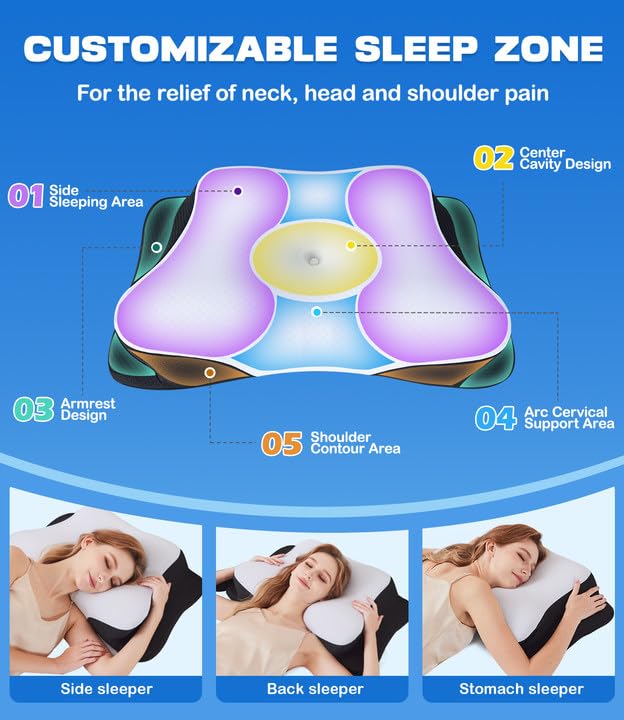 【multifunctional areas provide comprehensive support】Cervical neck pillows adopts multi-functional zoning design and integrates ergonomic principles to provide all-round support for the neck, shoulders, head and arms. After using the memory foam neck pillow, the sleep level is significantly improved, and various physical discomfort caused by improper sleeping posture is reduced. Whether side sleeper, back sleeper or stomach sleeper, the memory foam pillow can provide just the right support to ensure that you can enjoy a relaxed and pleasant sleep experience all night