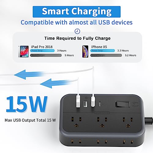 2-Side Insert Design: Three 3-pin plugs and three 2-pin plugs are distributed on both sides of the USB C power strip, and the 2-side design can shunt the plugs so that they’re going to not block each other and make them tidier. The spacing between outlets is 1.81In, which can accommodate large plugs.