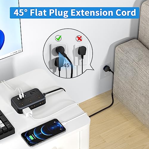5Ft Flat Cord Extension Cord: The length of this USB extension cord is 5 ft, which is suitable for outlet expansion on the desktop or bedside table. 0.11 In flat cord can be utilized in more places, it is going to not take up too much space. The extension cord with multiple outlets is compatible even under rugs or under doors.