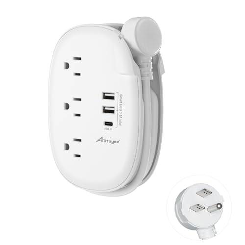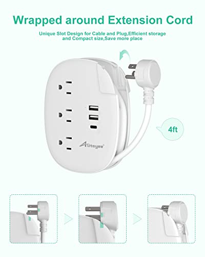 Specification: Alitayee USB C Travel Power Strip,Portable Power Strip with 3 Outlets 3 USB Ports Fast Charge, USB Extension Cord with Flat Plug and 4ft Wrapped Around Extension Cord for Cruise Travel Home Office
