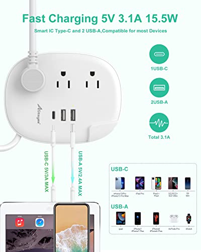 3 USB Trip Extension Cord-USB-C port provides 5V 3.0A 15W ,3 USB port total provides 5V 3.1A- 15.5W fast charging.With smart charging technology,the Type-C and 2 USB-A ports will identify your devices automatically and deliver the fastest and most suitable charging speed.Great for most of your electronic devices that accepts fast charging(NOTE:The Type-C port doesn’t beef up Macbook,Macbook Air,Macbook Pro or any other laptops which needs 14-22V charging voltage)