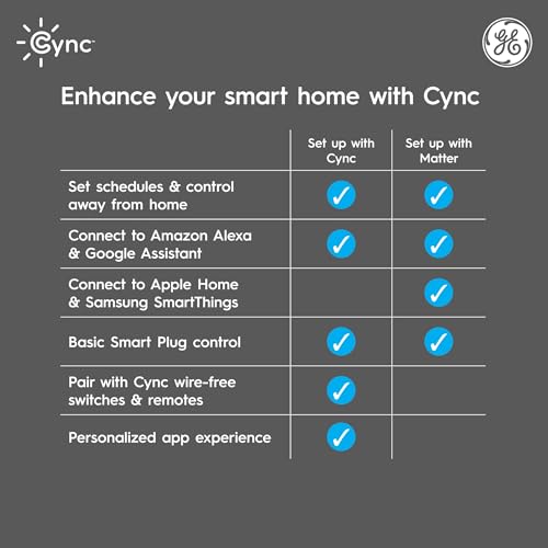 The On/Off Cync Smart Plug makes any lamp or device that plugs into a wall outlet smart. The built-in WiFi bridge adds out-of-home Keep watch over for your lighting and devices and voice Keep watch over when paired with a voice assistant. This smart plug is Matter Compatible meaning that it can connect directly to leading smart home apps such as, Amazon Alexa, Google Assistant, Samsung SmartThings, and Apple Home for hands-free voice Keep watch over. The plug also enables scheduling and scene setting to traditional bulbs and devices. The Smart Plug adds smart functionality to fixtures where smart bulbs would possibly not fit or match the look of the fixture. Pair the Smart Plug with Cync Smart Bulbs in other fixtures and Cync Smart Switches to Keep watch over all of your lights together. Use the Smart Plug with other devices like curling irons, fans and electronic devices to turn them on or off remotely or schedule them to operate around your routine. The Smart Plug connects directly with Google Home and Amazon Alexa devices (sold one after the other) – no hub required. Simply plug into a standard wall socket and you are ready to go.
