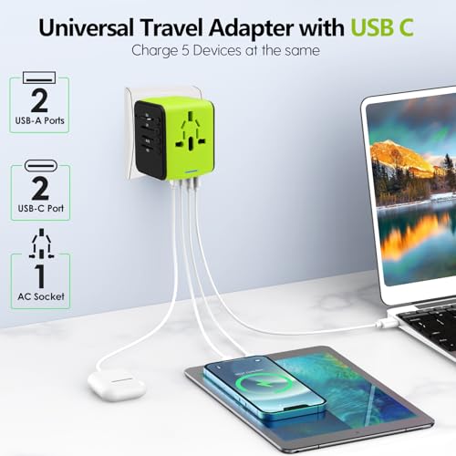 Specification: JMFONE International Travel Adapter Universal Power Adapter Worldwide All in One W/Smart High Speed 2.4A 4 USB Perfect for European US, EU, UK, AU 160 Countries (Green)