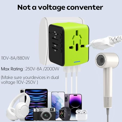 POWER RANGE – AC 100V-250V, MAX 8A 1920W output. 5V 3.4A 4 usb worldwide travel charger. 4 AC power plug sockets – Output: 800W at 100v, 1920W at 240v. High power travel adapter all in one offer you a safer and efficient charging for your devices. NOTE: IT DOES NOT CONVERT FROM 220V TO 110V OR VISE VERSA! And PLEASE DON’T USE IT TO CHARGE THE DEVICES WHICH POWER IS HIGHER THAN 2200W!