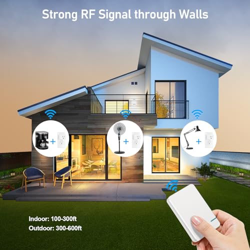 γImpressive 600ft RF rangeγ433Mhz Strong RF signals go through walls and doors without interfering other electronics, 600ft RF range in open areas, 100ft indoor; Remotely turn on/off lighting fixtures, lamps, fans, routers, or other hard-to-reach appliances just with a press of the wireless switch.