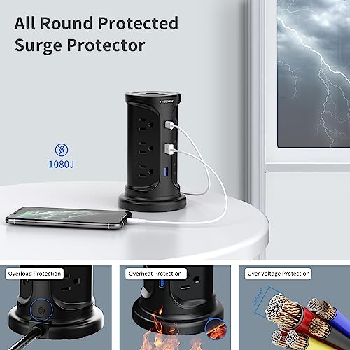USB- C Charge Up To 30% Power Strip Surge Protector: NVEESHOX Surge protector tower provides over-surge, over-current, over-load, over-heating, short-circuit, and high-temperature protection. 4 USB ports total 3.4A, each USB A port features 2.4A Max output. USB C charging port features 3A Max. Built-in with smart technology, it detects charging devices and delivers optimal charging speed automatically, compatible with most USB devices.