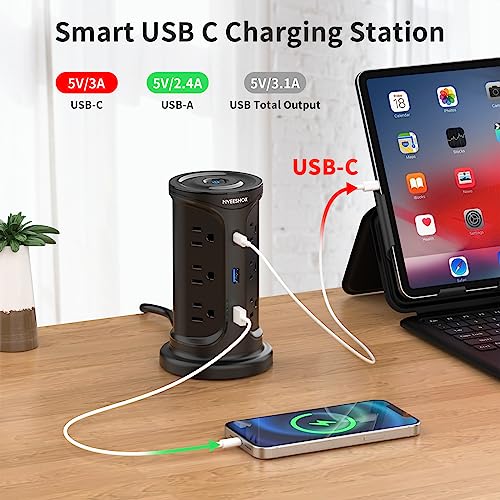 USB- C Charge Up To 30% Power Strip Surge Protector: NVEESHOX Surge protector tower provides over-surge, over-current, over-load, over-heating, short-circuit, and high-temperature protection. 4 USB ports total 3.4A, every USB A port features 2.4A Max output. USB C charging port features 3A Max. Built-in with smart technology, it detects charging devices and delivers optimal charging speed routinely, compatible with most USB devices.