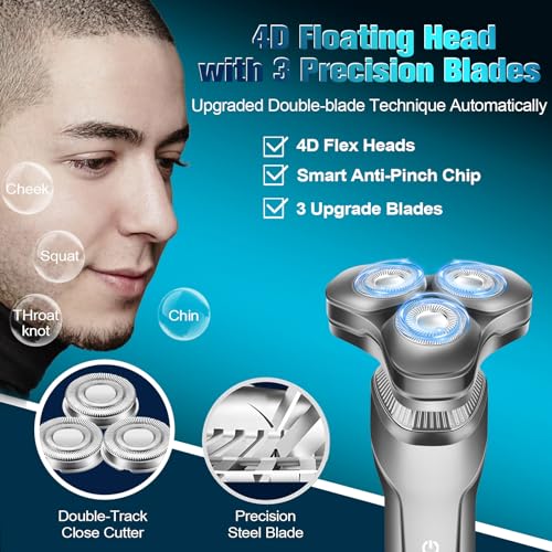 【3D Floating Dual-track Shaver Heads】The 3D floating electric razor for men with dual-track stainless steel blades fits the contours of the face, neck and even chin for a quick yet clean shave. Rounded edges move smoothly over skin to reduce irritation, give you a smooth, close and comfortable experience. This electric shaver for men is equipped with a high speed powerful motor hat has premium quality to deliver quiet shaving.