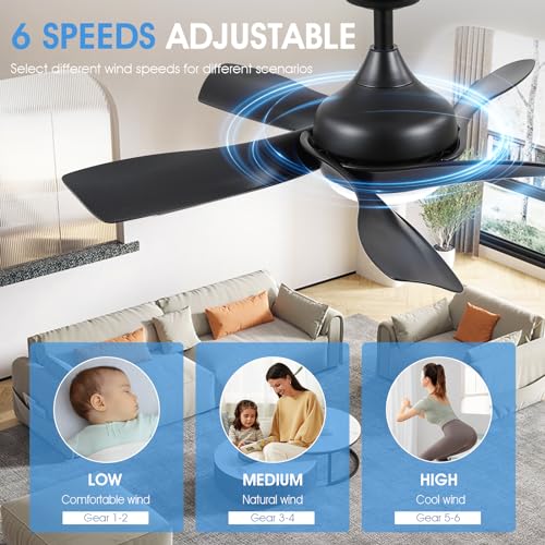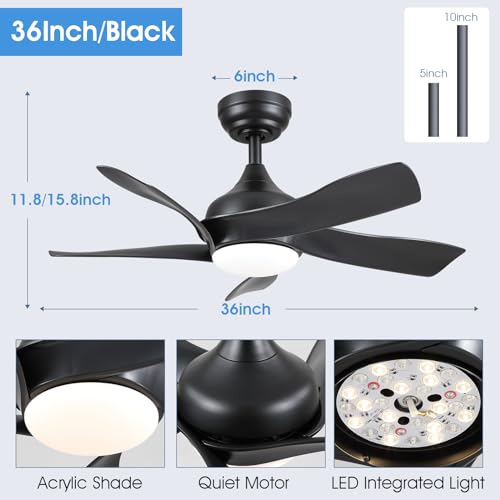 Specification: 36 Inch Ceiling Fans with Lights Remote/APP Control, 2 Downrods Flush Mount Ceiling Fans with Reversible 5 Curved Blades, 6 Speeds 3 Colors Dimmable for Bedroom Dining Room Kids Room, Black