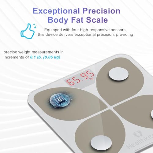 Specification: Body Fat Scale, Smart Bathroom Weight Scale, BMI Body Composition Monitor, High Precision Health Analyzer with Smartphone App for Fitness Tracking 400 lbs/180 kg (White)