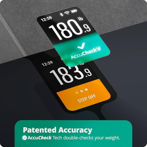 Proprietary Precision: Weigh up to 440 LB! The body fat scale uses AccuCheck to ensure accuracy via a two-step color-coded system. Orange means you’ve been weighed, and green means it’s verified!