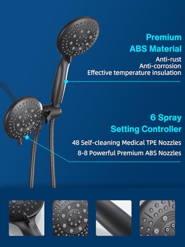 Specification: Cobbe 48-Setting High Pressure 3-Way Shower Head Combo, Hand Held Shower & Rain Shower Separately or Together, 4.7″ Dual 2 in 1 Showerhead with Stainless Steel Hose – Matte Black