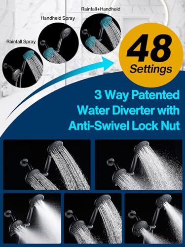 【48-Setting Modes】Switching between the use of two showerheads is achieved by adjusting the gears. Both the shower head and the shower handheld can be set to 6 spray modes, Spray/Mist/Massage/Spray+Mist/Spray+Massage+Water saving, you can open two showers at the same time and enjoy the difference spray modes with your family.