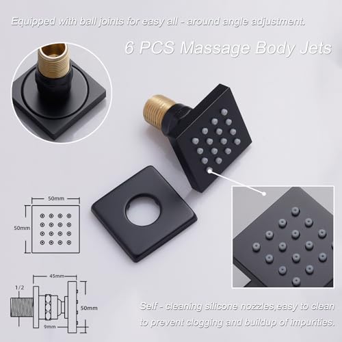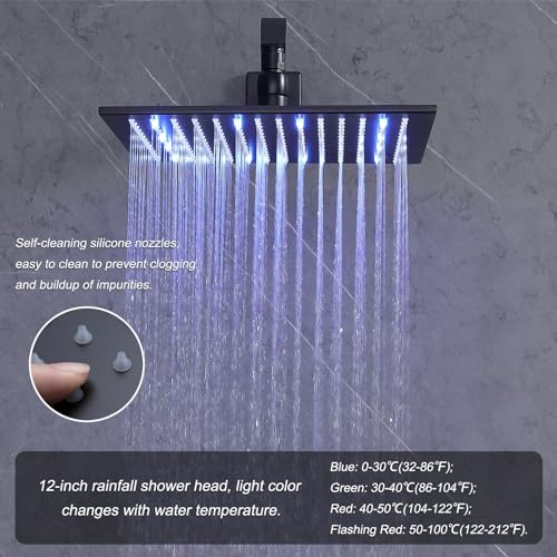 Specification: Full Body Shower System Thermostatic Matte Black Shower Faucets Set Complete Digital Temperature Display Shower Fixtures with 12 inch LED Rain Shower Head, Handheld Shower, 6 PCS Body Jets