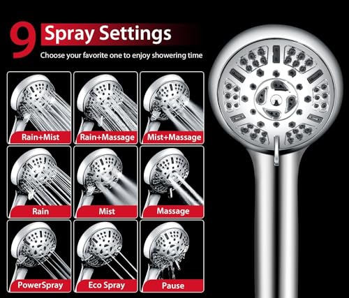Specification: GRICH 2.5GPM Shower Head with Handheld Spray Combo: 2 in 1 Rainfall Shower Head with Handheld Combo High Pressure Shower Head, 9 Spray Modes/Settings Detachable Shower Head with 60 Inch Hose