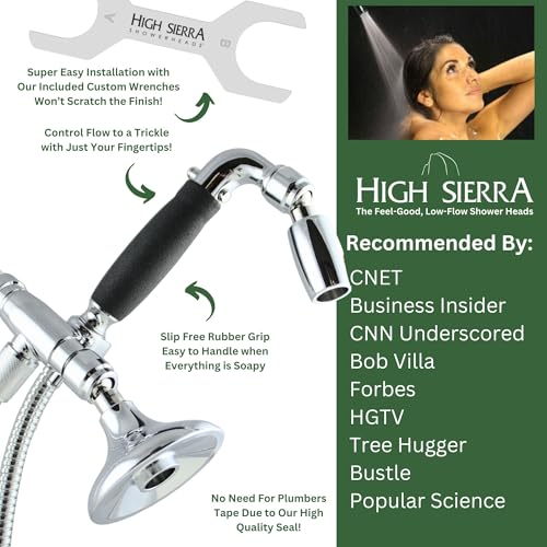 Specification: High Sierra Showerheads® – Solid Metal 1.8 GPM Low-Flow 4-Way ‘Half Dome’ Shower Head and Handheld Combination w/Slip-Free Grip – Brushed Nickel