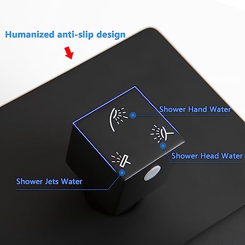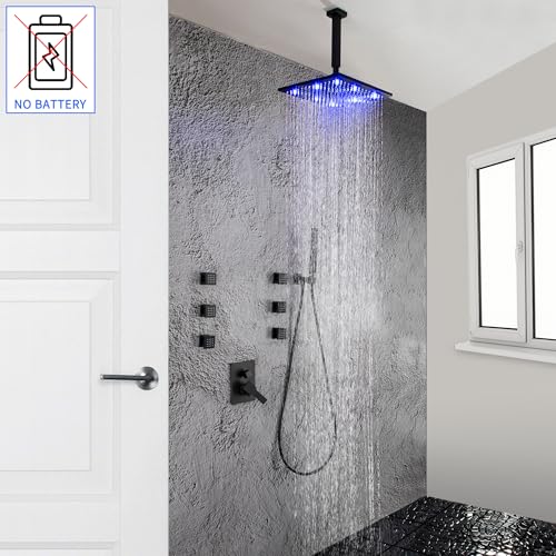 Specification: SKOWLL Matte Black High Pressure Shower Faucet Set with 3 Function Shower Faucet 12 Inch LED Square Shower Faucet Ceiling Mount Shower System with 6 Body Jets