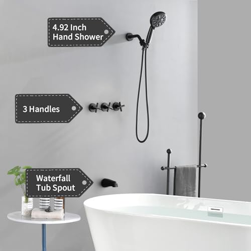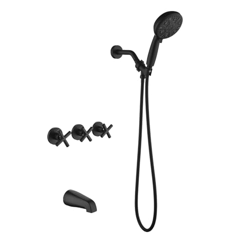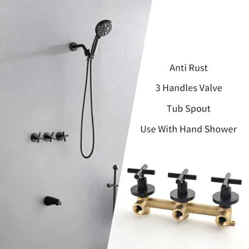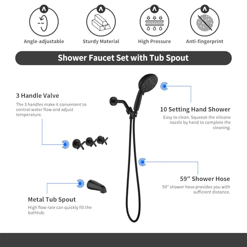 Specification: 3 Handles Tub Shower Faucet Set with 10 Spray Handheld Shower 4.7 Inch Shower Handheld Shower Tub Kit Wall Mounted Shower System with Tub Spout Matte Black Shower Fixtures Tub and Shower Trim Kit