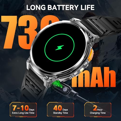 [730mAh Big Battery & LED Flashlight] – Foxhawk military smart watch has a 730mAh battery, which can work normally for 7-10 days with only 2 hours of charging and up to 40 days of standby time. You can wear it outdoors for a long time without worrying about charging. Foxhawk rugged smart watch features a small flashlight on the side to help you see your way and objects in the dark at night. It will be a great companion for outdoor enthusiasts!