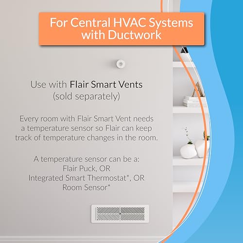FOR CENTRAL HVAC SYSTEMS WITH DUCTWORK: Every room with Flair Smart Vents needs a temperature sensor. Use a Flair Puck, integrated smart thermostat, or compatible room sensor.