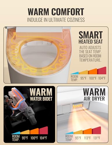 YEAR-ROUND WARMING COMFORT: Designed for maximum comfort, our bidet toilet features a smart heated seat, instant warm water with adjustable temperature and pressure, and a warm air dryer, keeping you cozy anytime.