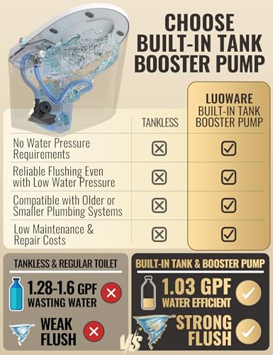 BUILT-IN TANK & ELECTRIC PUMP: The built-in tank and booster pump ensure powerful, quiet flushes with just 1.03 gallons per flush, making it water-efficient and ideal for homes with low water pressure.