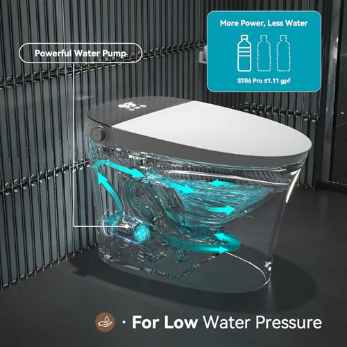 Powerful Flushing: Smart toilet with built-in water tank and Pump-assisted to Powerful flushing.Water merges and swirls 360°to flush every spot inside the toilet bowl. No water pressure limit, and suitable for various families. Powerful and water-saving (1.11GPF)