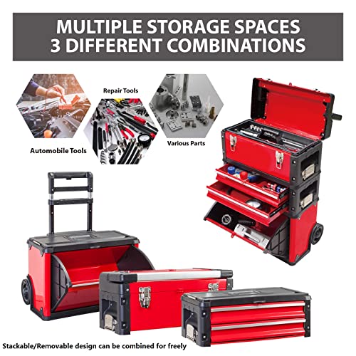Bottom section has a tilt drawer storage cabinet with the back housing the 2 wheels and the collapsible, telescopic maintain with a comfort grip; Each and every section can also be separated or connected depending on your tool storage needs